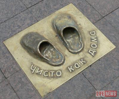В центре Тюмени на Цветном бульваре появился новый необычный памятник. Скульптура представляет собой бронзовую плиту с отлитыми на ней домашними тапочками и выгравированной надписью "Чисто как дома".