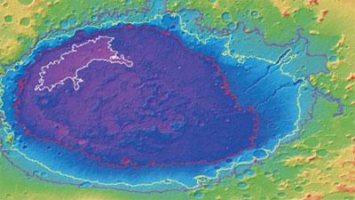 По словам ученых, это открытие было совершено в ходе анализа снимков равнины Эллада (самого большого кратера на Марсе, образованного столкновением с небесным телом), на востоке которой были обнаружены осадочные отложения, указывающие на присутствие там большого водоема.