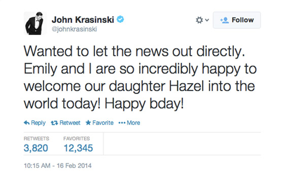 Вчера в семье актеров Эмили Блант и Джона Красински случилось радостное событие — на свет появился их первенец. Звезда фильма "Дьявол носит Prada" родила девочку вчера вечером, малышку назвали Хейзел. Об этом счастливый отец сообщил в своем микроблоге в Twitter