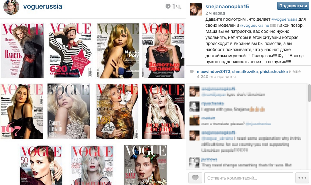На своей страничке в Instagram Снежана написала: «Давайте посмотрим, что делает российский Vogue для своих моделей и что делает украинский. Какой позор, Маша. Вы не патриотка! Вас срочно нужно увольнять. Нет чтобы в этой ситуации, которая происходит на Украине, вы бы помогли. А вы наоборот показываете, что у нас нет достойных моделей. Позор вам, фу! Всегда нужно поддерживать своих, а не чужих». Также Онопка заметила, что издание Vogue в Великобритании, Бразилии поддерживают своих моделей. И только украинская редакция полностью игнорирует местных девушек. «Для меня она Цукинова!» — исковеркала фамилию Цукановой разгневанная Онопка. «Вы только представьте, что в своей собственной стране я ни разу не была на обложке родного VOGUE. Это очень-очень плохо», — в сердцах пожаловалась Снежана, в свое время украшавшая обложки ведущих мировых изданий.