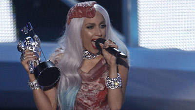 Каждый раз, выходя на сцену в новом облачении, Гага, как всегда, демонстрировала самые эпатажные наряды. Получая премию "Лучшее видео года", певица вновь шокировала зрителей эксцентричным платьем, сшитым из кусков сырого мяса и дополненным мясной шляпкой.