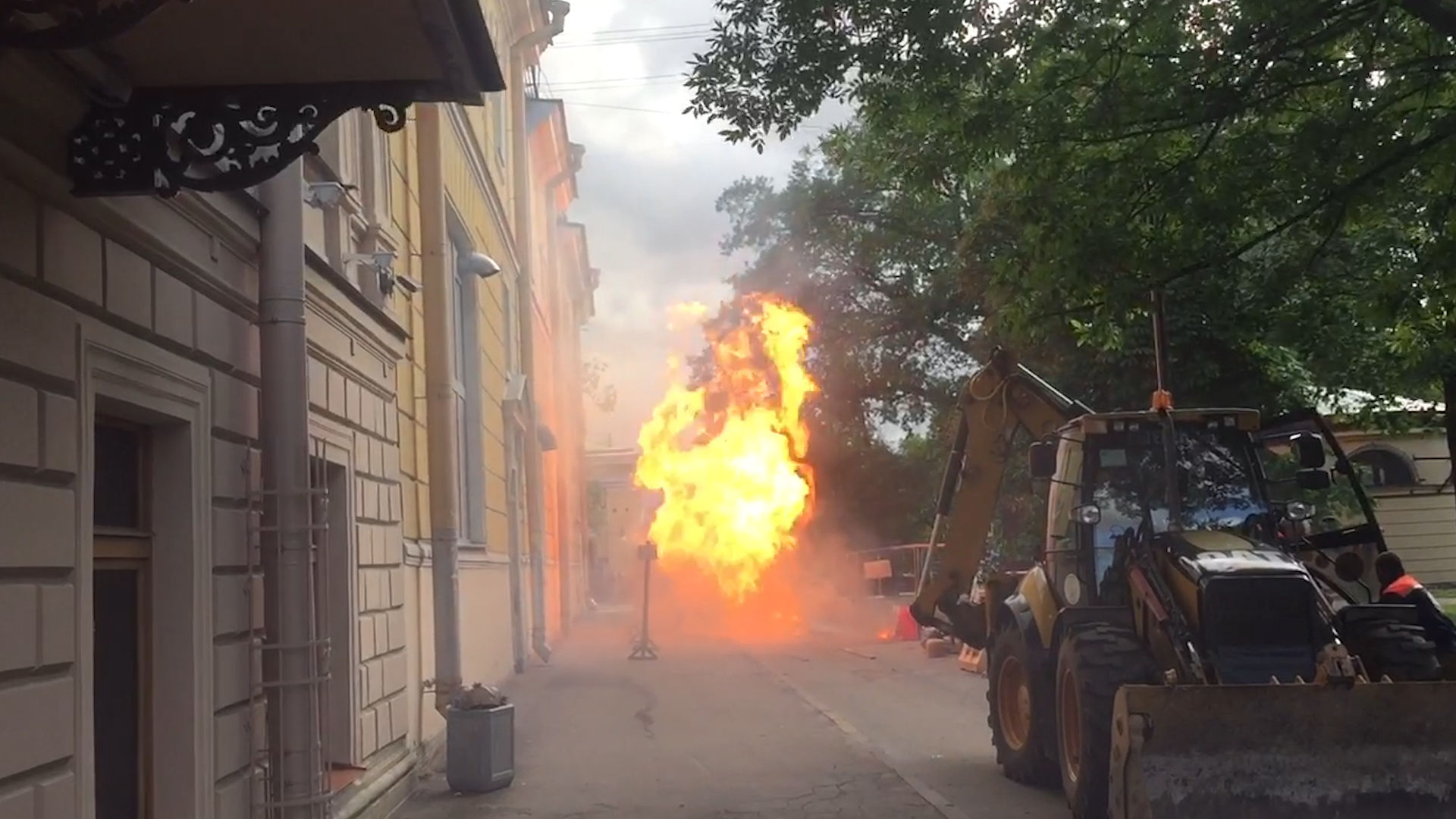 На месте прорыва произошёл большой пожар, огонь перекинулся на рядом стоящее здание.
