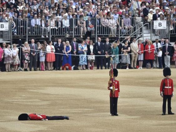 В Лондоне один из королевских гвардейцев упал в обморок прямо во время торжественного построения в честь дня рождения монархини у стен Букингемского дворца. С церемонии его пришлось унести на носилках.