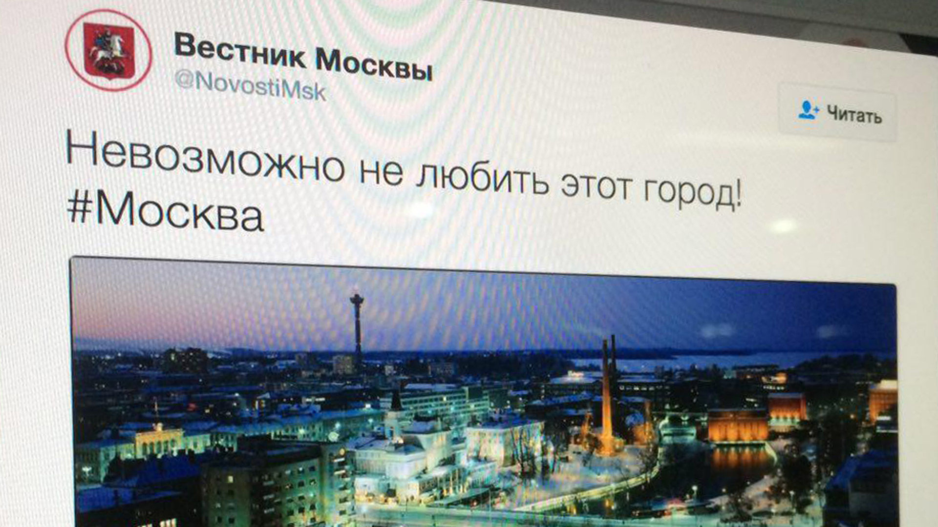 Вечером 13 июня в твиттер-аккаунте "Вестника Москвы" появилась фотография ночного города, подписанная: "Невозможно не любить этот город" с хэштегом #Москва.