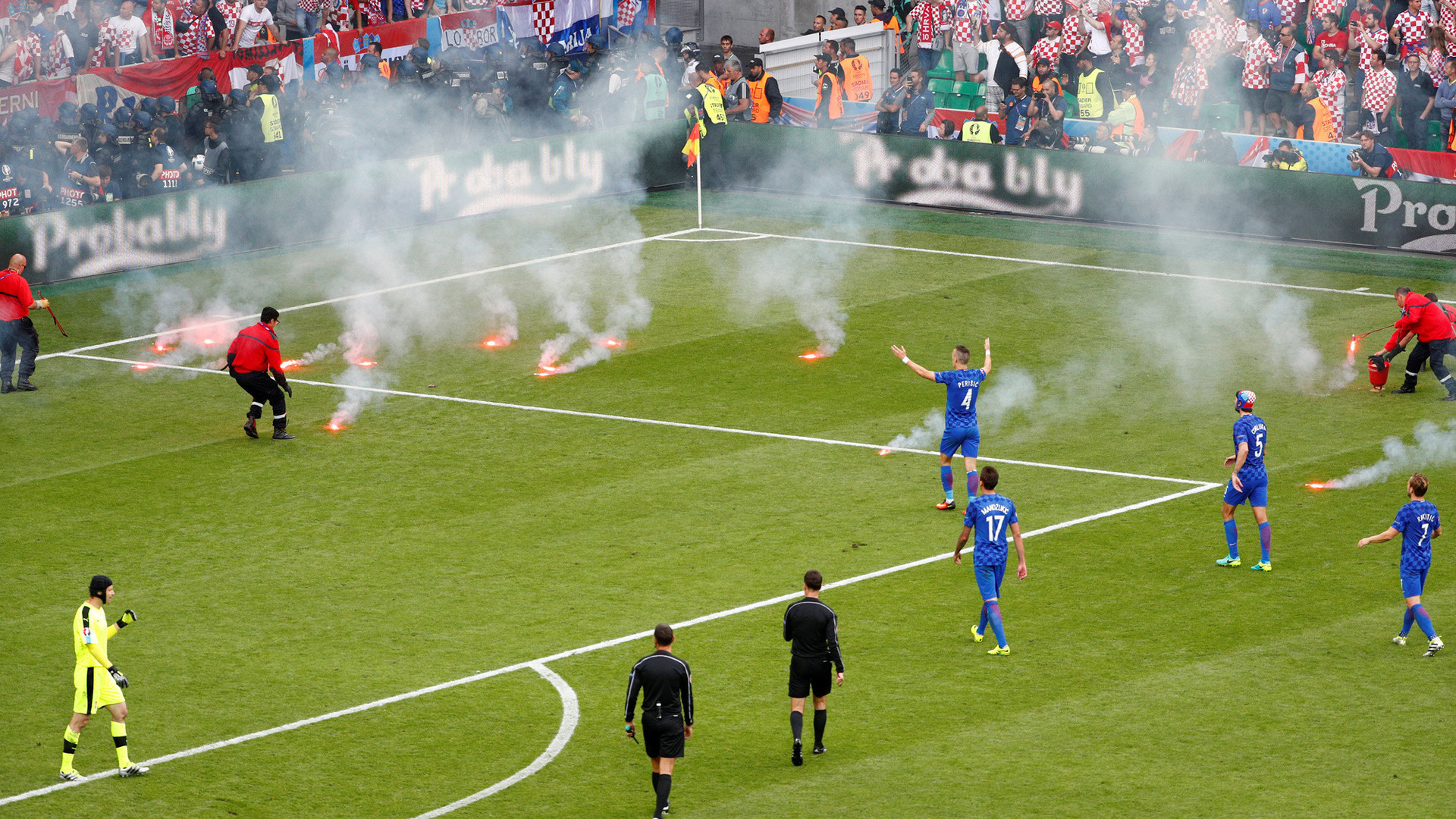 Болельщики сборной Хорватии закидали файерами и петардами футбольное поле во время игры с чехами.