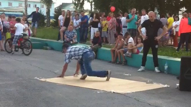 Мужчина с фигурой, далёкой от идеала, решил утереть нос профессиональным брейкдансерам.