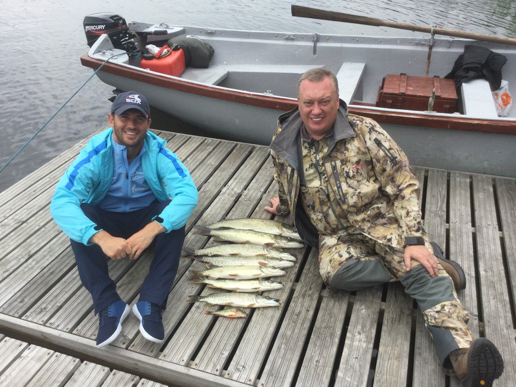 Нападающий "Зенита" Александр Кержаков вместе со своим тестем — председателем комитета Совета Федерации по регламенту и организации парламентской деятельности Вадимом Тюльпановым — поймал семь щук. Футболист поделился со своими фанатами фотографиями пойманной рыбы. Весь улов рыбаки разложили по размеру.