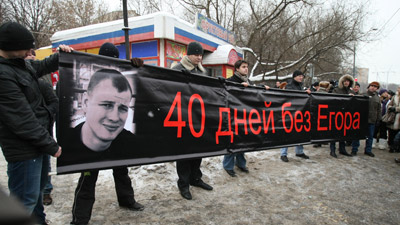 «Славянская сила» из семи человек во главе с Дмитрием Демушкиным растянула плакат «Сорок дней без Егора». Однако судя по рвению, с каким он раздавал интервью российским и иностранным журналистам, лидер «Силы» воспользовался печальной датой для самопиара.