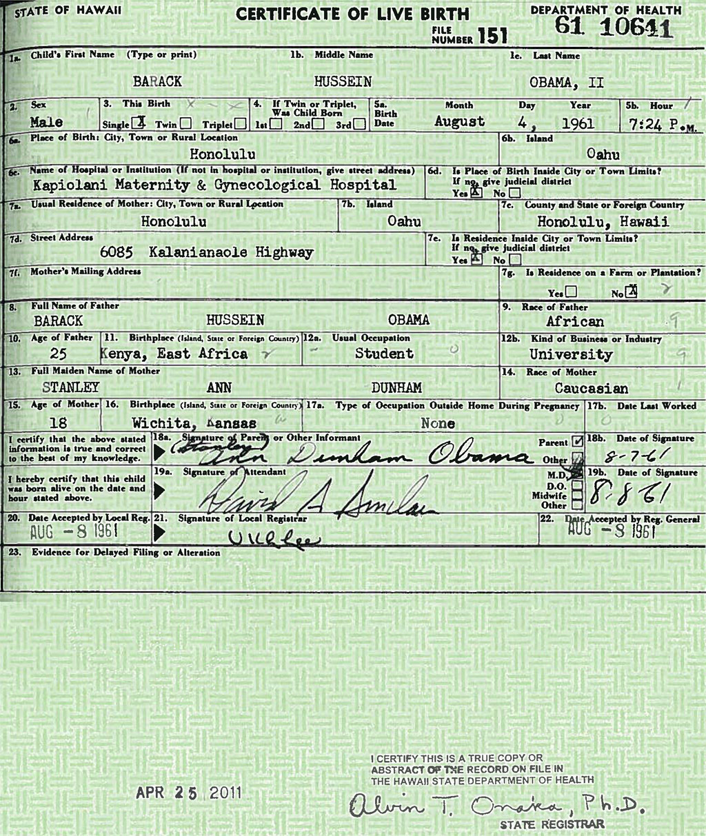 Согласно документу, лидер демократической партии родился на Гавайях, США.