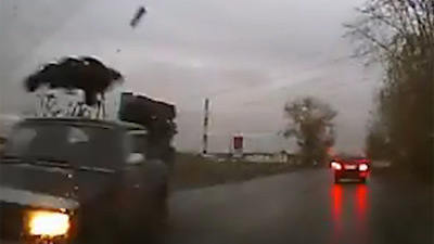 На кадрах, сделанных регистратором встречной машины, видно, как лихач врезался в легковушку и от удара подлетел на несколько метров.