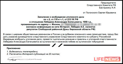 В заявлении на имя главы СКР Александра Бастрыкина Полонский просит "провести тщательное дознание и привлечь к уголовной ответственности Лебедева Александра Евгеньевича за хулиганство и нанесение побоев из хулиганских побуждений".