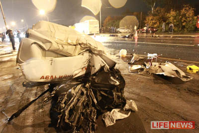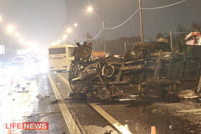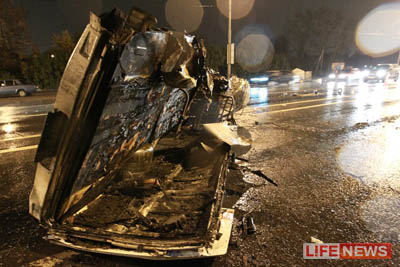 По данным другого источника, на встречной полосе, напротив, оказалась колона с полицейскими, отправлявшимися в командировку в Моздок. Как бы то ни было, удар оказался настолько сильным, что «газель» разорвало на две части. Сразу после этого машина загорелась.