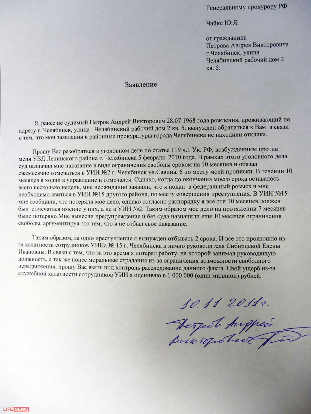 - Я писал письма и в прокуратуру Тракторозаводского района, куда ходил отмечаться первые 10 месяцев, и в прокуратуру Ленинского района, где отмечался потом! - негодует Андрей Петров. - Везде говорили, что не видят поводов для прокурорской проверки. У меня забрали два года моей жизни из-за несуществующего преступления. Я оцениваю свой ущерб в миллион рублей.
