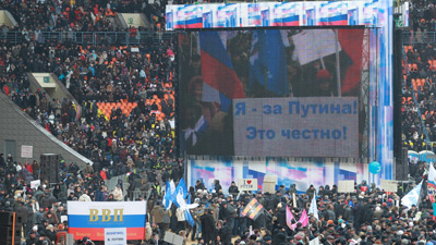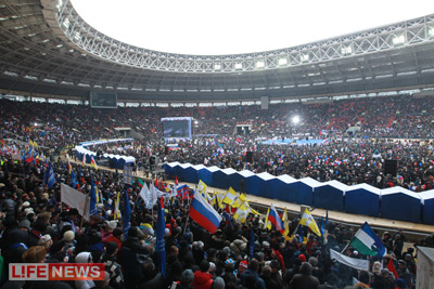 На территории спорткомплекса «Лужники» собралось более 130 тысяч сторонников кандидата в президенты Владимира Путина, начался митинг.
