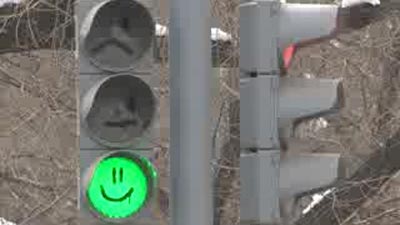 Три типа смайликов нарисованы на красном, желтом и зеленом стеклах электронного регулировщика.