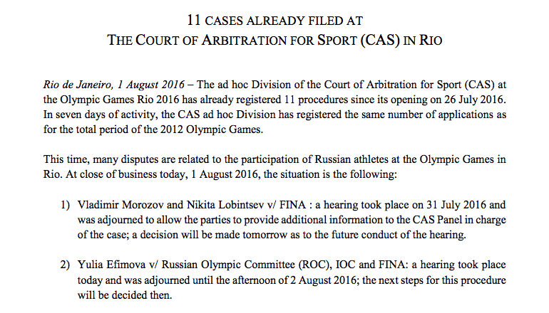 4. Российская федерация тяжёлой атлетики — иск к Международной федерации тяжёлой атлетики, слушания должны пройти утром 3 августа;