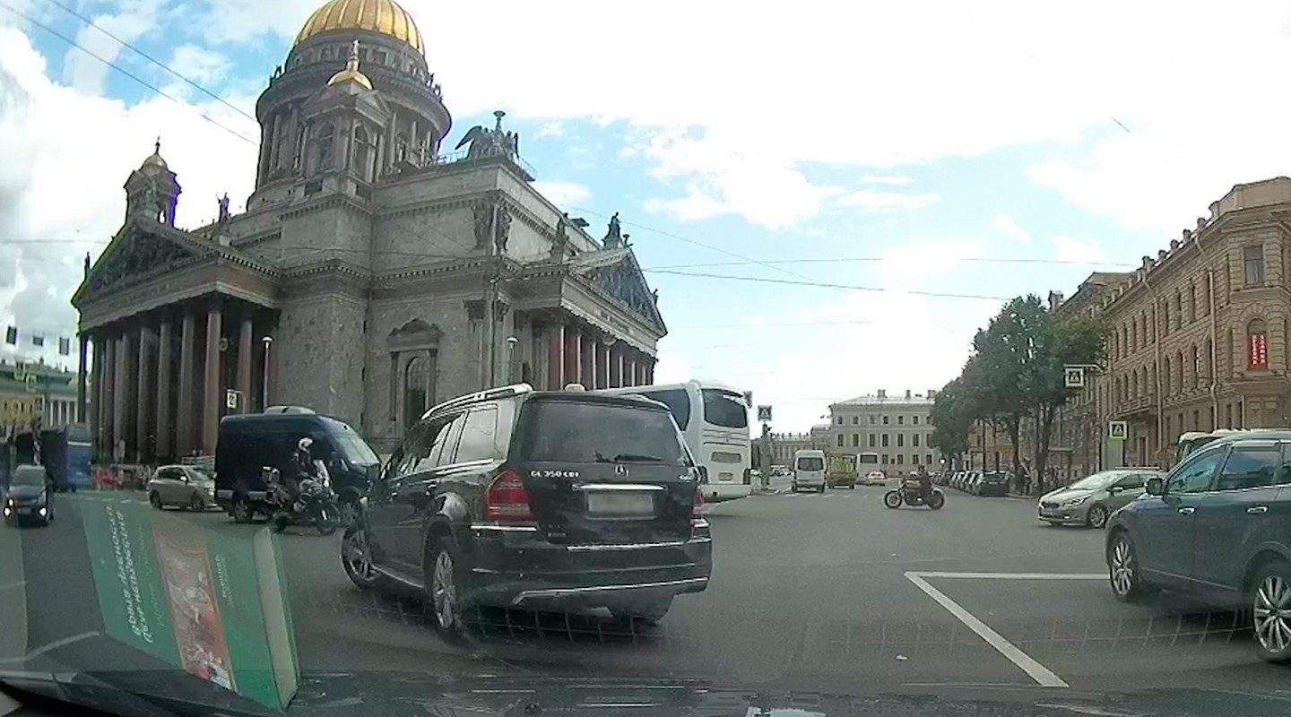 Камера видеорегистратора зафиксировала нарушение ПДД прямо напротив Исаакиевского собора.