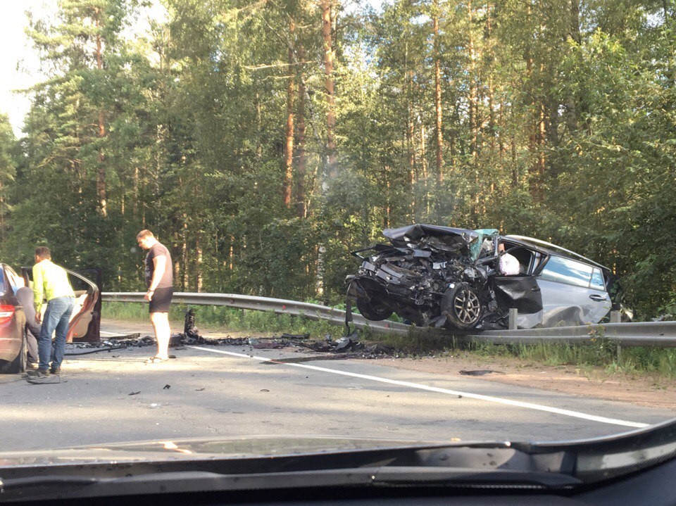 На 43 километре Выборгского шоссе столкнулись две легковые машины, один человек погиб, четверо получили тяжёлые травмы.
