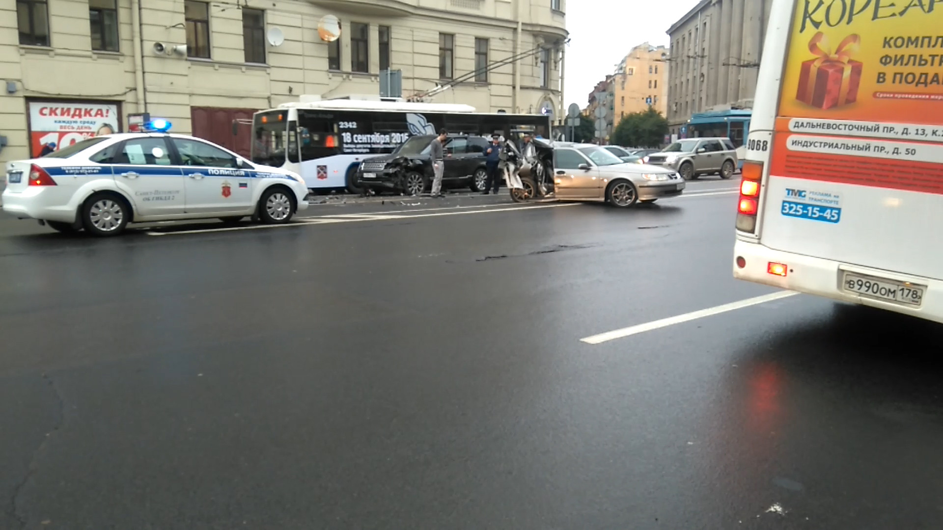 Утром 7 сентября, около 9 часов на пересечении Суворовского проспекта и Кирочной улицы произошла крупная авария. На дороге столкнулись сразу три автомобиля: Range Rover, Saab и Skoda. Все три автомобиля получили серьёзные повреждения.