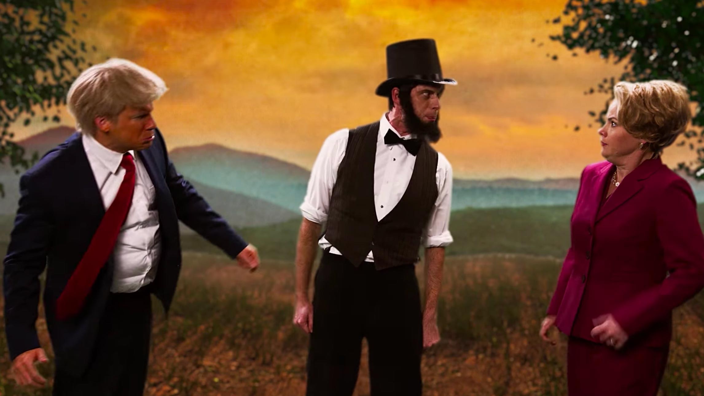 Ближе к финалу ролика в поединок между Трампом и Клинтон вмешивается Авраам Линкольн, который занимает сторону Клинтон.