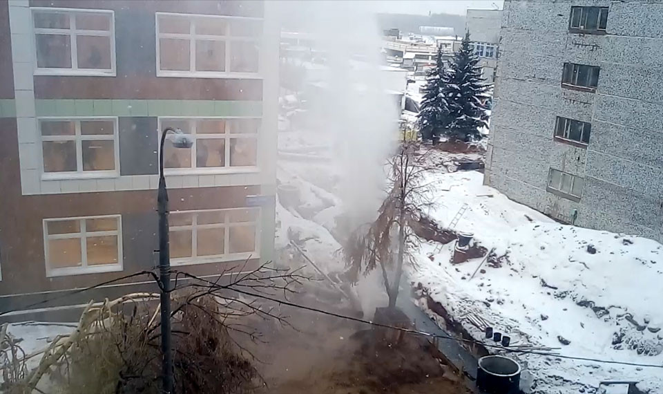 Фонтан горячей воды высотой с трёхэтажный дом бьёт из-под земли на улице Авиаторов. Что стало причиной прорыва, пока неизвестно, на место выехали сотрудники коммунальных служб для устранения аварии.