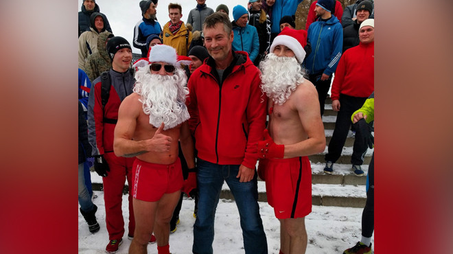 Поддержать мэра к назначенному сроку подошли два десятка любителей бега. Особо ярко среди них выделились два полуголых Деда Мороза. Атлеты увлекаются закаливанием и заявили, что январские мягкие морозы им совсем не страшны.