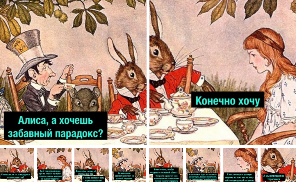 В Сети набирает популярность новый формат комиксов, построенных на смеси русских и английских слов с использованием транскрипции. При этом активно используются знакомые всем образы и персонажи — в частности из старых мультфильмов. Сюжет же интерпретируется и искажается до абсурда. Лайф собрал несколько примеров: