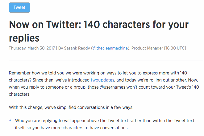 При публикации ответа на сообщения пользователей в сети микроблогов Twitter имя собеседника больше не будет учитываться. Тем самым сообщения, для которых предназначено 140 символов, можно будет делать большей длины.