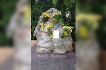 Киевляне несут цветы к замотанному плёнкой памятнику Булгакову, который вот-вот снесут